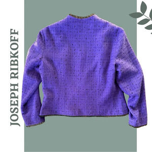Boucle zip front dress jacket, lined with a metallic thread. Gathered black ribbon trim. Excellent condition.