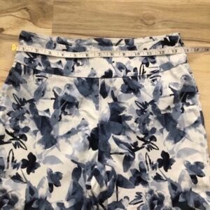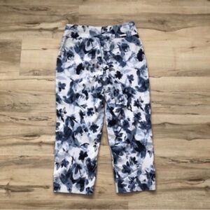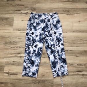 Chic floral leggings. Features blue and white design. Comfortable and stylish.