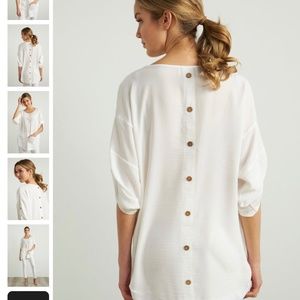 Wind down for the weekend in this casual, relaxed fit Joseph Ribkoff top. Twin front pockets provide a sense of practicality while the buttons lining the back are a decorative and unique touch.