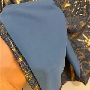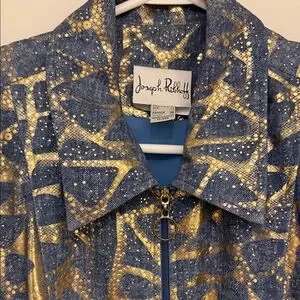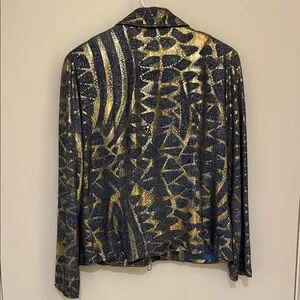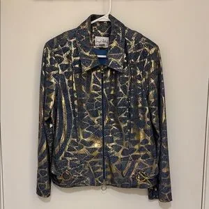 Elegant jacket with gold accents on denim patterned fabric. Features a front zipper and stylish gold accent pockets and speckled pattern.
