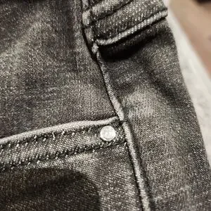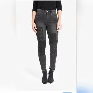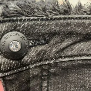 size 22 brand new with tags Charcoal, black and lots of rhinestones frayed at the ankle and top of the waist
