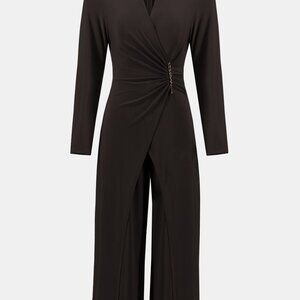 This silky knit wrap jumpsuit features an elegant ornament at the side waist, with long sleeves and a flattering culotte Wide Leg silhouette. The overlay adds dimension, while the back zipper opening ensures ease of wear. This unlined piece is perfect for a bold yet refined look.