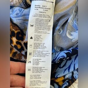 Chic Joseph Ribkoff tunic with leopard and baroque print, rhinestone V-neck, and 3/4 sleeves. Perfect for day-to-night style.