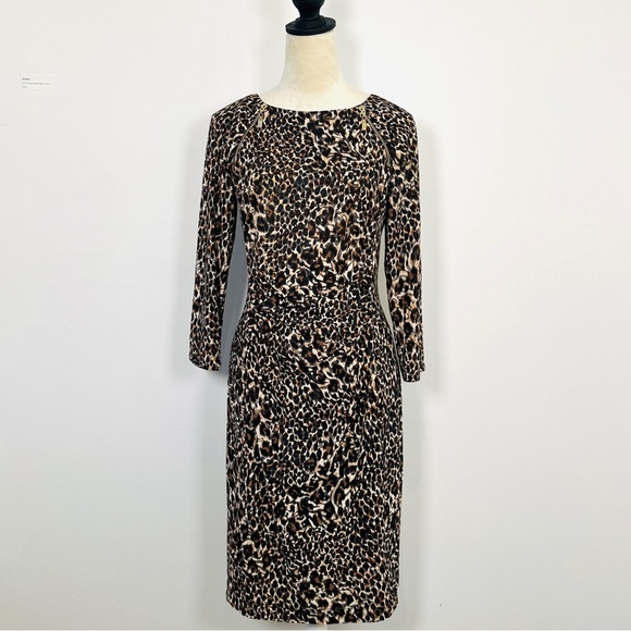 joseph ribkoff, leopard print dress, ruched dress, animal print dress, animal print, mobwife dress, cocktail dress, evening dress, fitted dress, statement dress