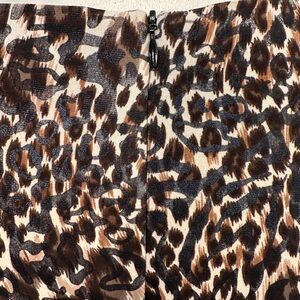 Chic Joseph Ribkoff leopard print mid dress with flattering ruching through the waist and a sleek body-skimming fit. Features gold zipper detail at the shoulders and a soft stretchy fabric that hugs in the right places.