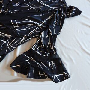 The garment features a high-contrast abstract or "wavy line" print in black and white. It has see through areas on some sleeves and waist line.