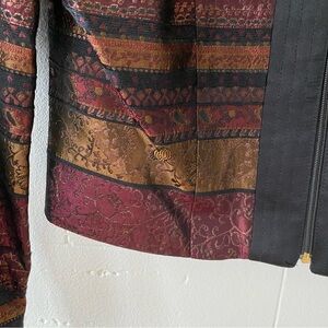 Unique and true to the brand, this Joseph Ribkoff piece is a standout! Featuring a striking multicolor design with rich burgundy and bronze tones. This jacket also has small integrated shoulder pads for a structured look, a fully lined interior and a gold zipper. The intricate pattern adds a touch of elegance to your wardrobe. In perfect condition.