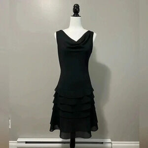 Like new condition! Beautiful black chiffon with a tiered ruffle skirt, draped neckline and lined.