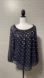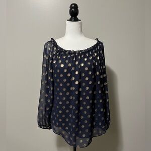 Lightweight semi sheer peplum long sleeve elastic cuff tunic, metallic polka dot detail with rounded ruffled neckline that can be worn onff shoulder and a rounded hem.