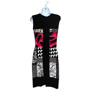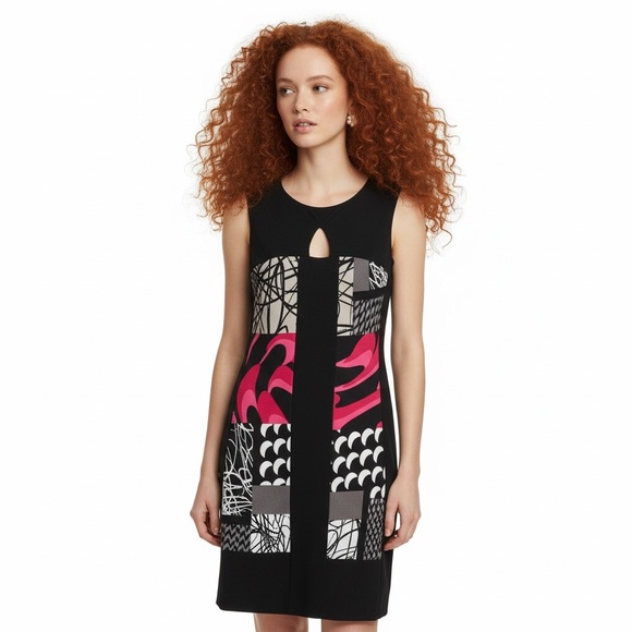 Joseph Ribkoff mixed pattern shift dress. Pullover style. Lined. Lots of good stretch (Jersey). Keyhole at the neckline. Sleeveless. Colors of white, black and hot pink.