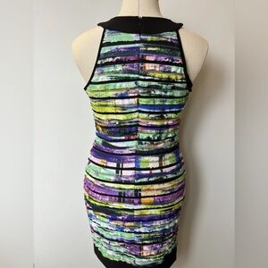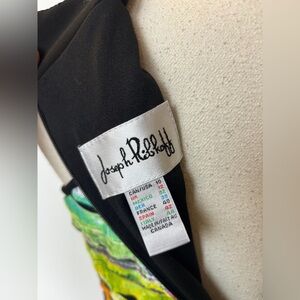The colors blend beautifully in this exciting Joseph Ribkoff dress. The form fitting silhouette with back zipper is figure enhancing too.