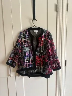 Bold abstract multicolor jacket with open front. Black trim and three-quarter sleeves. Lightweight layered look with vibrant accents. Versatile for dressy or casual wear.