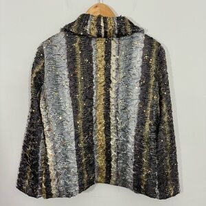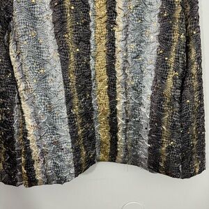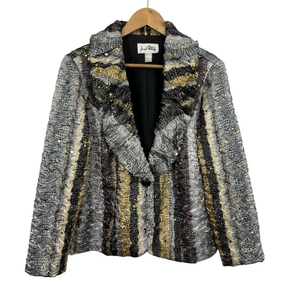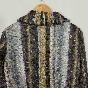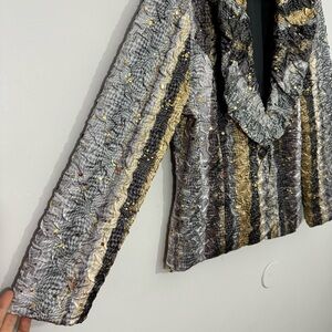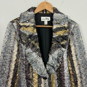 Stylish textured jacket with a mix of gray, gold, and black tones. Features a unique pattern and elegant design. Perfect for any occasion.