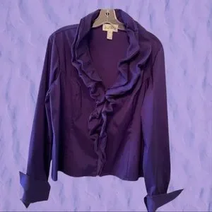 Elegant purple blazer with ruffled front. Long sleeves with stylish cuffs. Perfect for formal occasions.