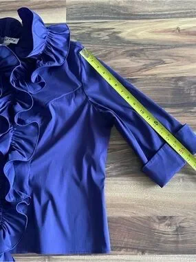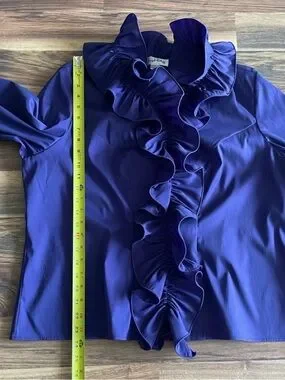 Sophisticated blouse with cascading ruffle front. High ruffled neckline adds drama. Three-quarter sleeves with turned cuffs. Luxurious drape and polished finish.
