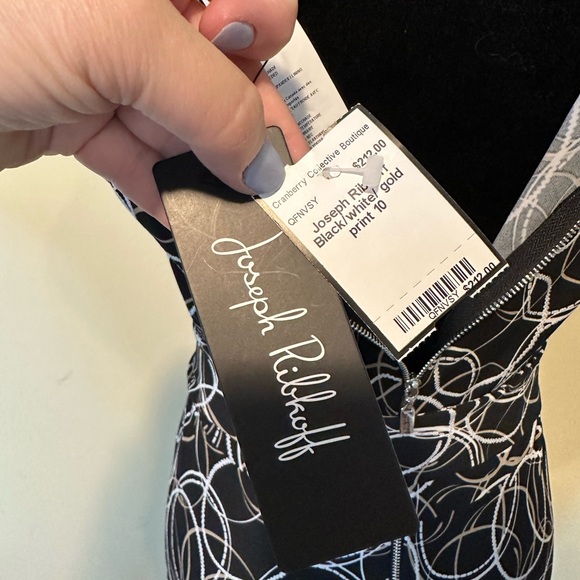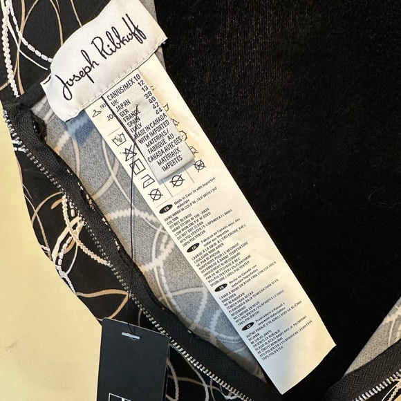 Joseph Ribkoff Jumpsuit in size 10. Black with circle pattern in white and beige with a fabric waist tie. Never worn; new with tags.