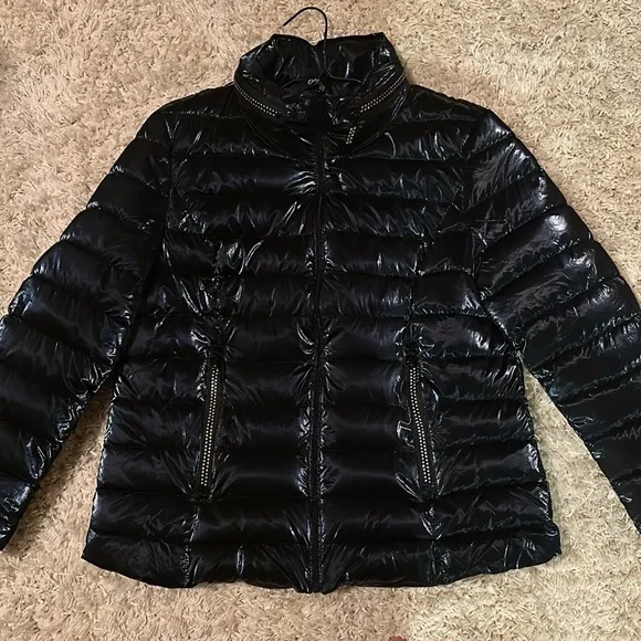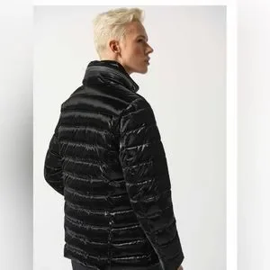 Beautiful dark blue, NEW condition Embrace the colder weather wearing a style like this Joseph Ribkoff puffer coat. It features a smooth, satiny shell with a glossy finish, turning this cold weather staple into a trendy, must-have for your wardrobe. Front zipper pockets add a touch of practicality, while the high collar keeps your neck warm when you need it most. Bling on zipper, pockets