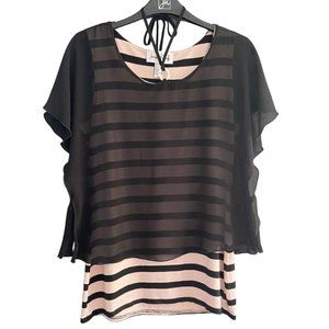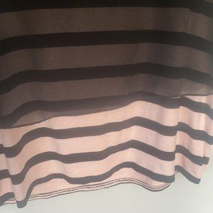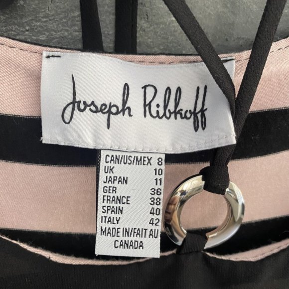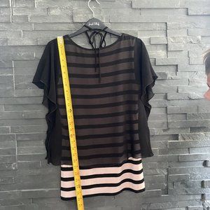 Very cute on and light weight Joseph Ribkoff short sleeve blouse/tank top.. No material tags inside but the tank underneath feels like a soft jersey. It is a light pink and black stripe and is attached to the what feels like a chiffon black cover. The black cover is very flowy and is open on both sides and can be closed with single button(each side) Good condition. Very slight pill on the tank underneath but not that noticeable. Overall nice condition. This Joseph Ribkoff top has a tie for around the neck. Can be worn with it up or tuck it in if you don't want to see that.