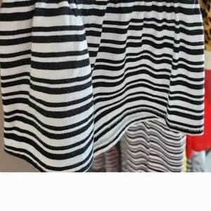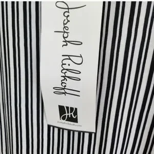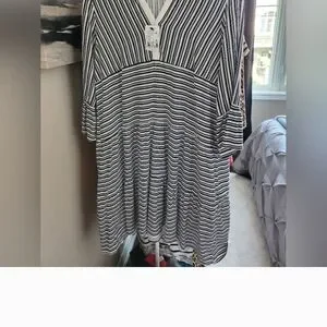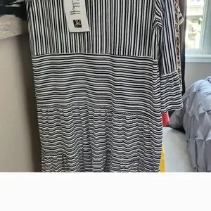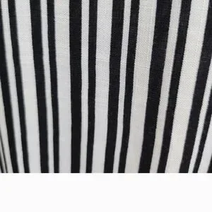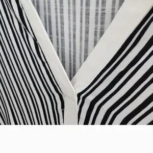 Elegant monochrome dress with vertical stripes. Features a classic V-neckline. Ideal for versatile styling.