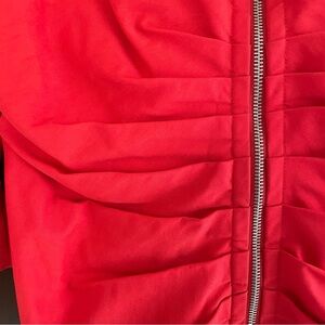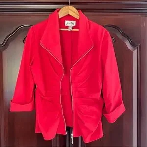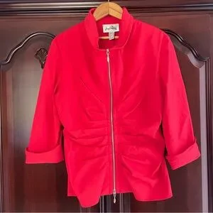 This ruched jacket has a front zip with classic collar and three-quarter length sleeves. The hem on this fitted jacket hits at the hip with full coverage through the torso.
