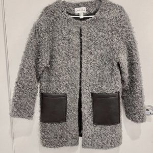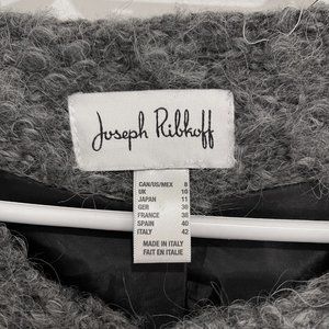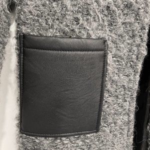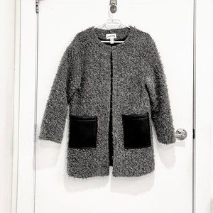Joseph Ribkoff Coat Size 8 Warm and Fuzzy Satin Lined Black Faux Leather Patch Pockets Hook and Eye closure at round neckline 20.5 " (52cm) across chest 34" (86.4 cm) length 55% Wool / 45% Polyester