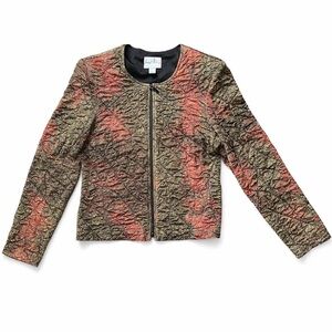 Chic jacket with a unique textured design. Features a blend of red and brown colors. Perfect for adding a stylish touch to any outfit. This jacket is much more sparkly in person. It is made from very stretchy, lightweight fabric and beautiful fall colours. It has a double zipper and shoulder pads which give it a retro look. It is in very good condition.