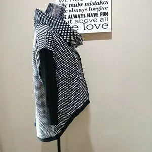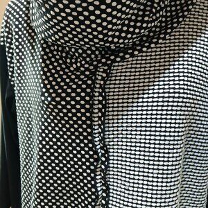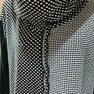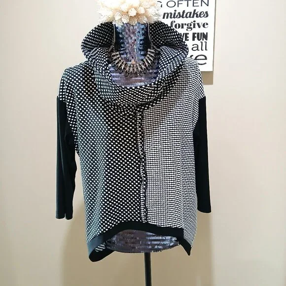 This top is in lovely condition. The sleeves are 3/4 length. It is very comfortable and easy wear. I wore this top with Sympli bottoms. Very stylish combo! From my private collection. Well taken care of. I took out the fabric tag because it was scratchy. The sleeves are a stretch jersey-like fabric. I believe the body of the top is a polyester fabric. A great layering piece.