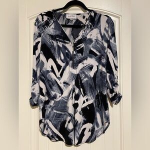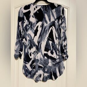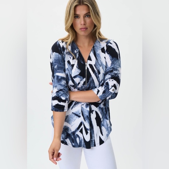 This seemingly simple tunic is taken to another level with its abstract print and zipped neckline. Cut from a luxurious silky knit fabric that will keep you comfortable all day long, this top also features three-quarter sleeves with faux tab and button as well as delicate shirring for added detail.