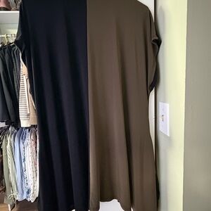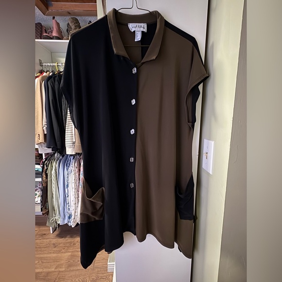 Joseph Ribkoff tunic style top in khaki and black. This item is in size 10 and features a button front and two side pockets.