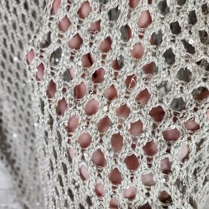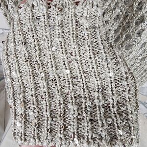 detail, this sweater features a V-neckline and delicate crochet knit adorned with shimmering sequins, creating a stunning texture and sparkle.