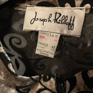 Joseph Ribkoff velvet burnout jacket featuring a black and silver or gold floral pattern. It has a zip-up front and a slightly ruched or gathered design on the front panels.