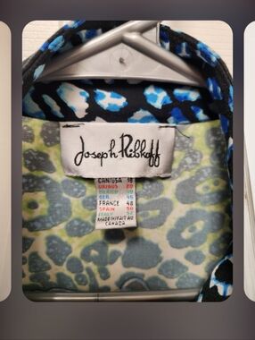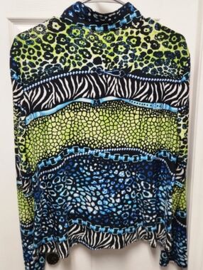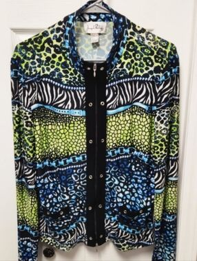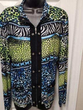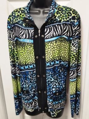 🌿 Joseph Ribkoff abstract jacket. Vibrant, multi-colored animal and zebra print pattern. Blue green black white, front pockets, zipper closure, long sleeved. Joseph Ribkoff is a Canadian fashion brand.