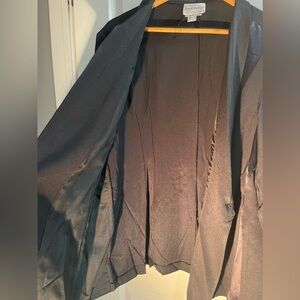 70s style vintage Joseph Ribkoff blazer/jacket, flowy viscose/ acetate blend with satin waist insert/trim. Fitted at waist for a slimming silhouette. Hook/eye closure.