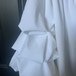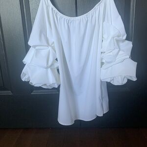 Joseph Ribkoff : Beautiful white blouse Size 6. Worn once. A small mark on left side 5” from neckline near left side but not noticeable when on. Ruffled sleeves.