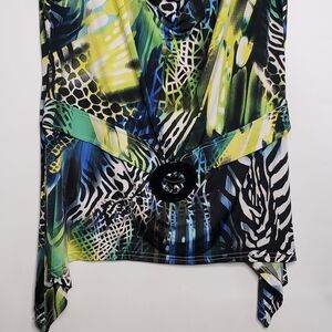Vibrant multicolour animal print pattern. Featuring short sleeves, shark bite hem and V neck. Faux belt detail