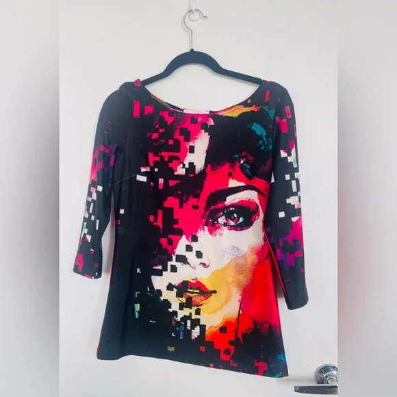 Gorgeous satiny fabric with fun print in multi-colours. Cute with leather leggings.