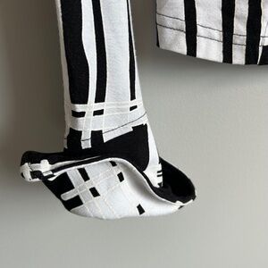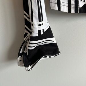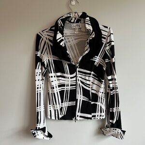 Unique striking top with double collar wired for pliability. Geometric black and white pattern, zip front. Lay flat measurements: Pit to Pit: 18" Length: 21" Sleeves: 23"