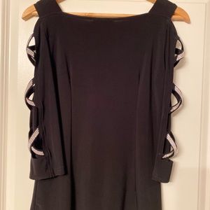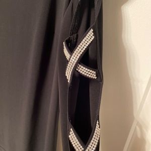 Beautiful black blouse, with cutouts on arms. Has rhinestone detailing on 3/4 length sleeves.