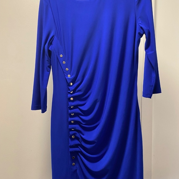 Button dress designed by Joseph Ribkoff size 14 has a simple rounded neckline, a three-quarter length sleeve, is fitted featuring buttons detailing from the breast line to mid-thigh on one side that create a unique ruching that gathers in the front and has a hemline that falls just above the knee.