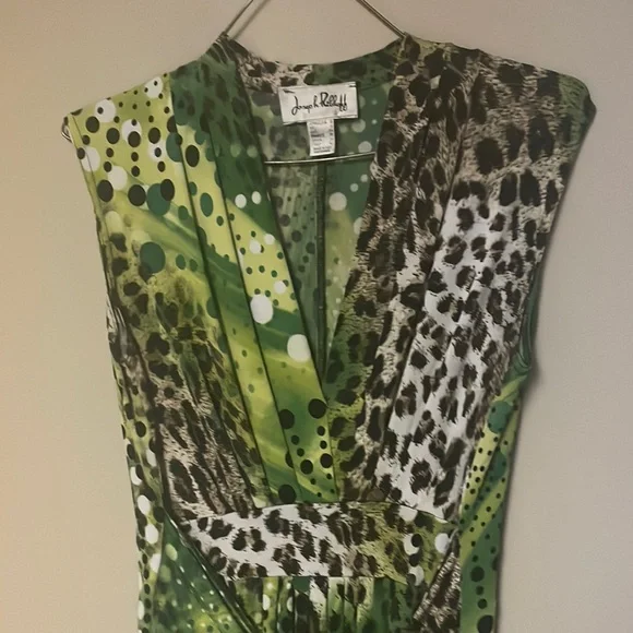 Animal prints are in again. This dress is easy care-easy wear. Front tie and lots of give for all the right places. I would say it’s a generous 6.