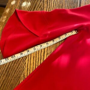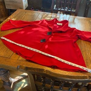 Beautiful red jacket from Ribkoff . Size tag missing but I bought this for myself and I’m size small or 6 or 8 in this brand . It’s loose fitting so fits different body types . I carried it to a wedding but never wore it , so like new . The style is really unique with the extra large square buttons .