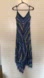 This is in excellent used condition. Beautiful jewel tones with reflective sequins. The dress drapes beautifully. This is wrinkle free and very packable. There is a dark blue polyester lining that goes to the knees.