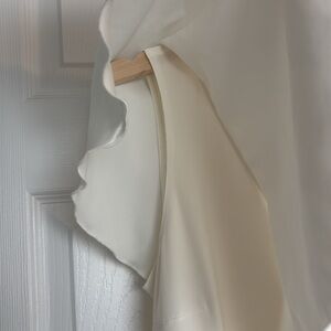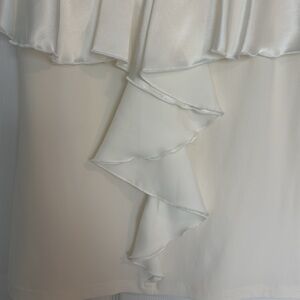 Gorgeous satin ruffle top from Joseph Ribkoff. Simple cream tank top with ruffle detail down front and satin overlay.
