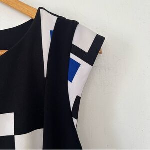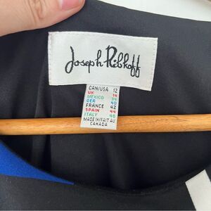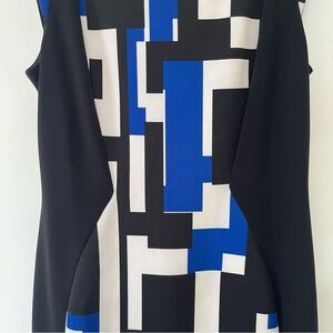 Joseph Ribkoff, bold geometric pattern dress, cap sleeve sheath, structured silhouette, figure-flattering fit, modern art print, eye-catching design, elegant and edgy, statement dress, stretch fabric, knee length, office to evening, contemporary sophistication, designer style, vibrant pattern, upscale fashion, sleek and polished, timeless yet bold, dressy and professional, boutique quality, for someone who loves fashion-forward pieces, clean lines, and confident, artful style.