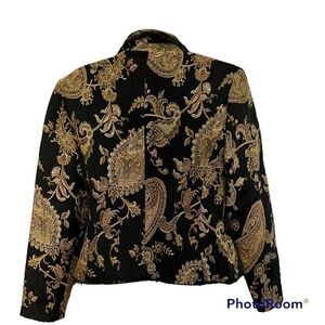 Joseph Ribkoff tapestry blazer, black and gold, jewelled front button, two front pockets with flaps. In very good pre-owned condition.