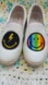 two white slip-on shoes, each with a different smiley face patch sewn on the front. One shoe has a black patch with a yellow smiley face and a lightning bolt, while the other has a rainbow-colored smiley face.