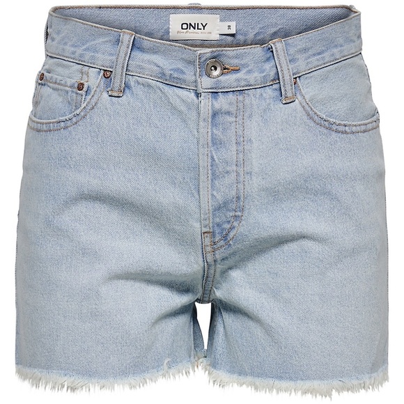 Five-pocket style high-waisted denim shorts featuring belt loops and a front zip fly with button closure.