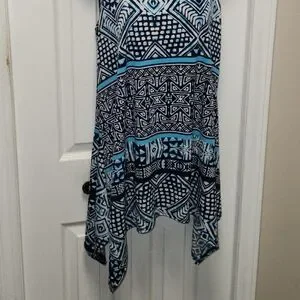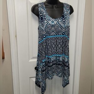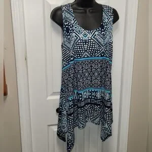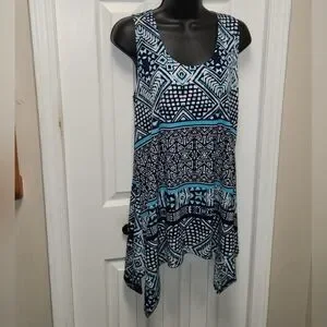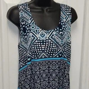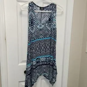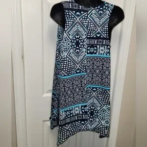 🌼 Jostar sleeveless top. Shark bite hem, blues and white, geometric designs, pull-on styling, easy care polyester blend.