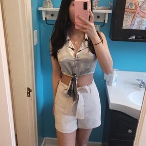 Silver Cropped Vintage Tie Waist Shirt