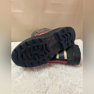 Brighten up rainy days with these adorable Joules floral striped rain boots in navy blue and cream with bold pink flower accents. Designed with Joules’ signature British countryside charm, they feature a buckle detail, contrast pink lining, and the brand’s iconic bunny logo on the sole.